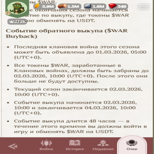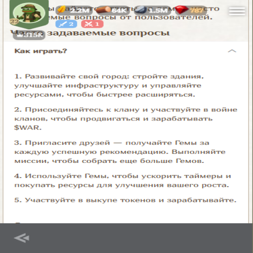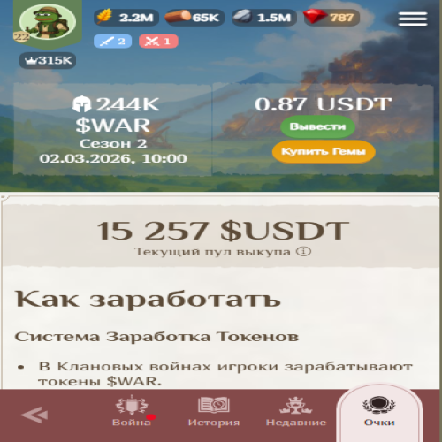 Развивайте свой город, стройте здания, увеличивайте войска, вступайте в кланы, воюйте с другими кланами и зарабатывайте $WAR, которые можно обменять на USDT.